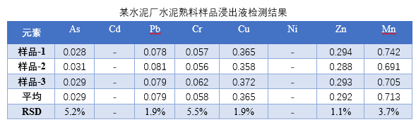 實驗依據GB 30760-2014 《水泥窯協同處置固體廢物技術規范》的要求,采用ICP-5000電感耦合等離子體發射光譜法對水泥浸出液進行了分析,檢測結果穩定性好,RSD≤5.5%。ICP-5000可應用于水泥及水泥