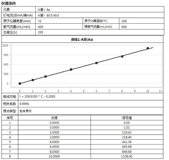 測試結果顯示:應用北京吉天儀器有限公司的 Kylin S12原子熒光光度計可以很好的測定尿液中砷含量 ,線性關系為0.9996 ;重復性RSD為 0.34% ;加標回收率為94.58% ~ 96.16% ,儀器檢出限0.027ng/mL ,質控樣品GDOHNYBZ025-2的砷測定值在真值附近。