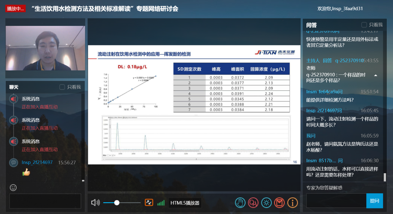 研討會不僅有行業專家老師的精彩報告,還有儀器廠商帶來的檢測技術的分享,吉天儀器的產品經理本次也在會中詳細講解了流動注射技術的應用領域,基本結構,運行原理以及未來的發展方向。特別是使用流動注射分析儀在檢測飲用水中揮發酚、氰化物、陰離子合成洗滌劑等指標和傳統手工法的對比優勢。會議直播間人氣鼎盛、討論激烈,大家就關于流動注射的檢測展開進一步的溝通和探討。