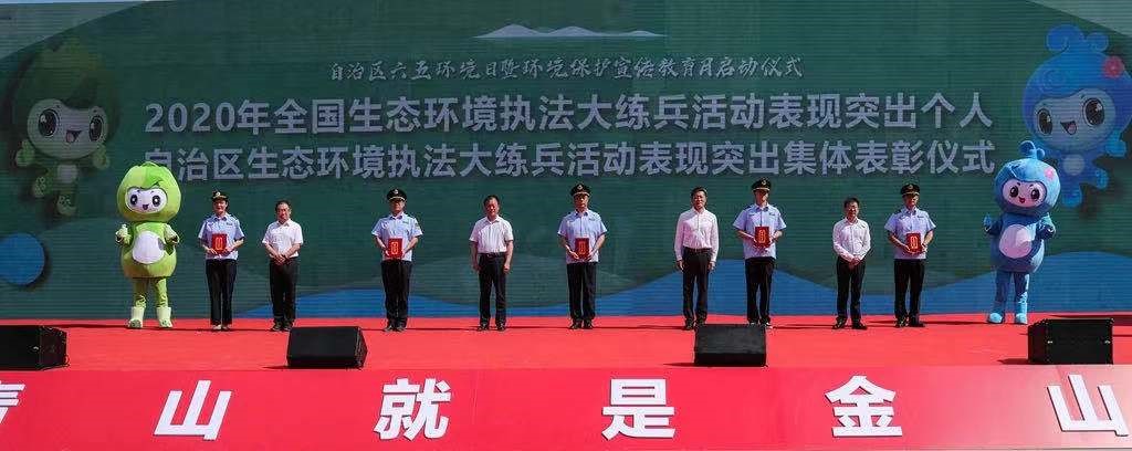 新疆維吾爾自治區(qū)生態(tài)環(huán)境廳黨組書記、副廳長戴武軍上臺為啟動儀式發(fā)表講話,協(xié)同自治區(qū)生態(tài)環(huán)境廳黨組成員、副廳長田豐、烏魯木齊市委副書記顧昱及烏魯木齊市委常委、副市長崔玉淼共同開啟“新疆維吾爾自治區(qū)六五環(huán)境日暨環(huán)境保護(hù)宣傳教育月”系列活動,并為獲得生態(tài)環(huán)境執(zhí)法大練兵活動的中表現(xiàn)突出的集體、個人頒發(fā)證書。